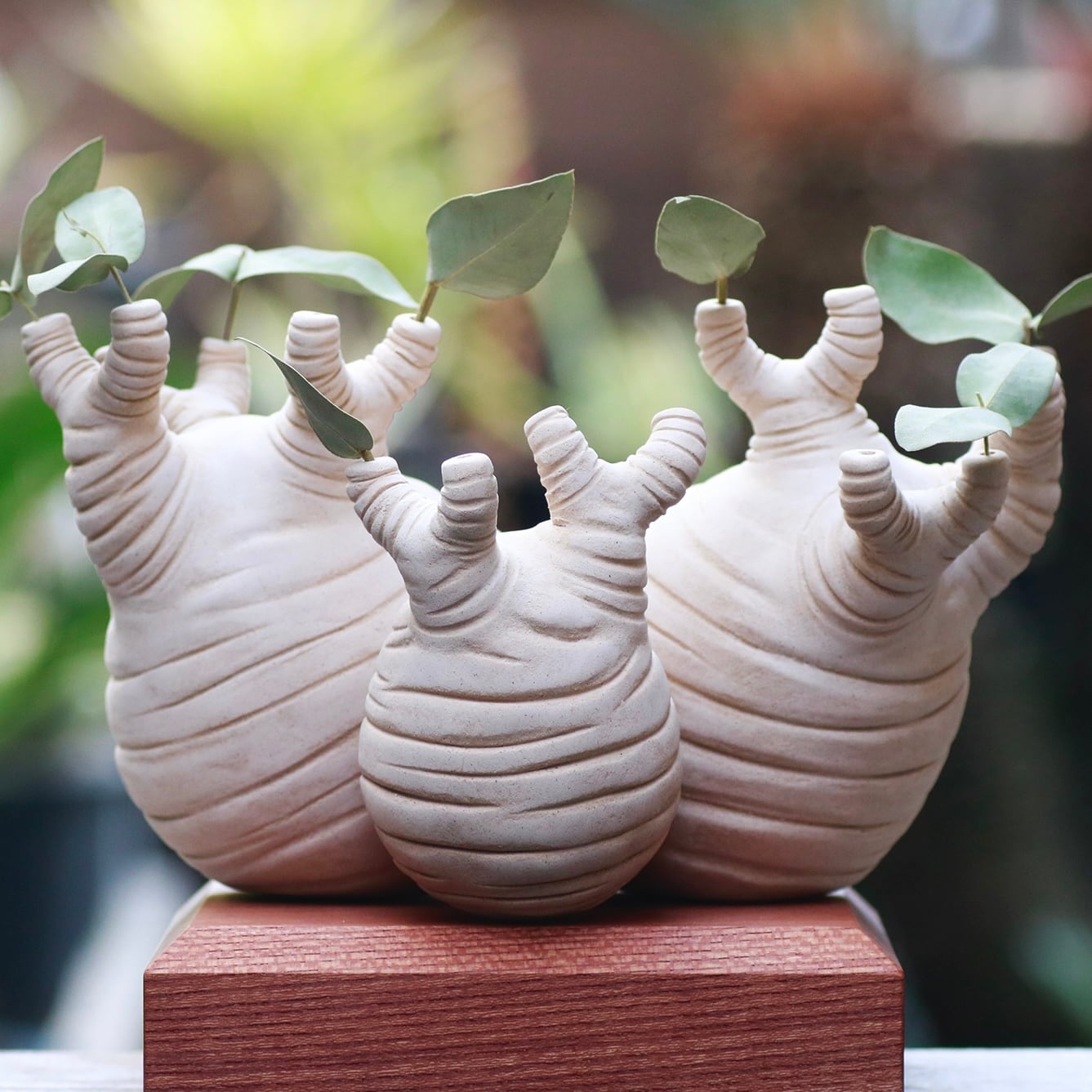 【商品説明】 木粉から作られた多肉植物のフィギュア。 一輪挿しや(ドライフラワー)、アロマストーンとしても楽しめます。 型を使用せず、全て手作りです。 植物と同じ様に個体差をお楽しみください。 ※写真の個体が届きます。 【サイズ】 塊根分の最大幅 : 約10cm 手足を含めた幅 : 約12.5cm 枝を含めた高さ : 約14.5cm 【下記お読みください。】 ※変色、欠けなどの経年変化が起こります。 ※木粉を固めた物なので水に浸す事はお控えください。(アロマ程度でしたら大丈夫です)